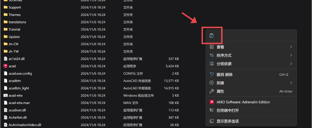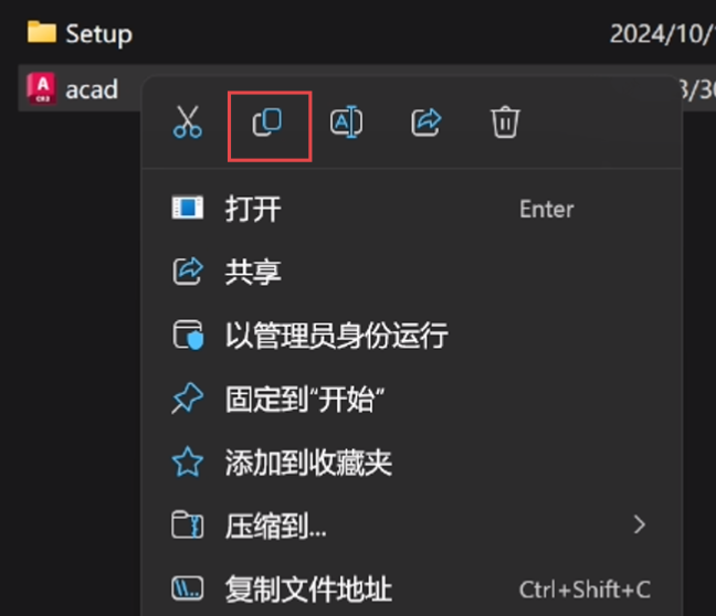 打开已经解压好的文件夹,鼠标右键复制acad