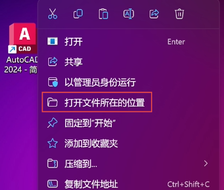 鼠标右击桌面的CAD2024,打开文件所在的位置