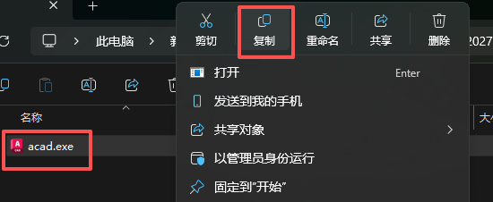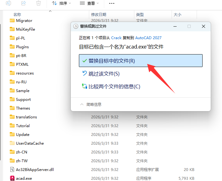 10、粘贴前面复制的acad.exe文件,并替换目标中的文件。