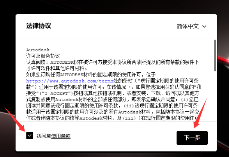3、勾选我同意使用条款,点击下一步。
